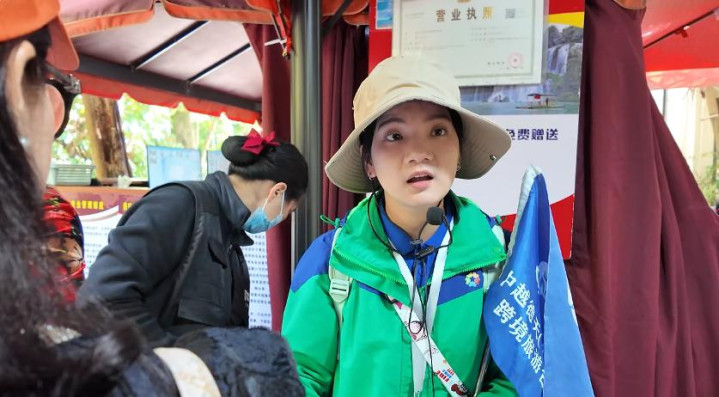 ▲正在向越南游客讲解德天瀑布的中国导游李菲菲