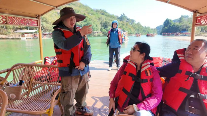 随着共建“一带一路”的深入推进,广西作为“一带一路”有机衔接的重要门户,与越南经贸文化交流日益紧密。德天村也感受到了这股暖流。村集体率先起步,整合零散的竹筏资源,成立了旅游公司。吕大明和许多在外漂泊的同乡一样,看到了回来的希望。“回来这边以后,景区设施也逐步搞完善起来了,也有专人来负责管理了。中旅公司参与进来了以后,做了一个很大力的宣传,然后那时候游客也开始多起来了,一天可能有差不多七八千人。”